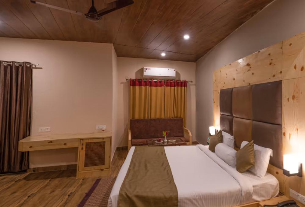 Spanning 325 sq. ft., our Standard Rooms are comfortable accommodations that are ideal for both leisure and corporate travellers. We offer a total of 9 rooms under this category and each room can shelter up to 2 adults and 4 children with ease. These rooms in Ramnagar are beautifully designed with wooden interiors and minimalist colour tones, for a relaxing time. The Standard Rooms come fitted with a myriad of modern amenities and facilities to ensure that our guests have a wonderful stay in Ramnagar.