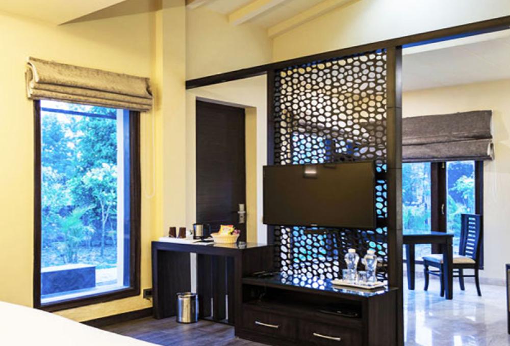 Our Leopard Duplex rooms offer a spacious 350 square feet bedroom area with a separate space for kids to sleep are designed to suit a family stay. These duplexes offer a splendid garden view, a separate sitting area and are equipped with a king-sized bed, air-conditioning, 42-inch television, tea, and coffee maker, wardrobe and electronic safe. The Leopard Duplex rooms at Corbett Wild Iris Spa & Resort, Ramnagar, comes with 24 hours room service by our dedicated and professional staff. Leopard Duplex is designed with exquisite design and decor to escalate your experience of accommodation.